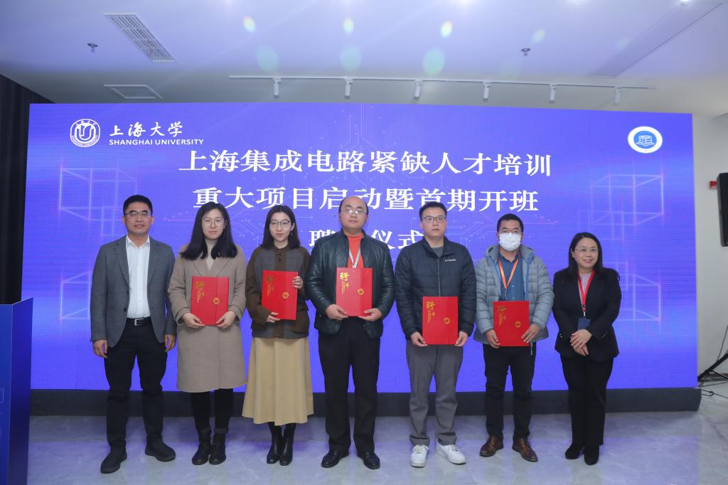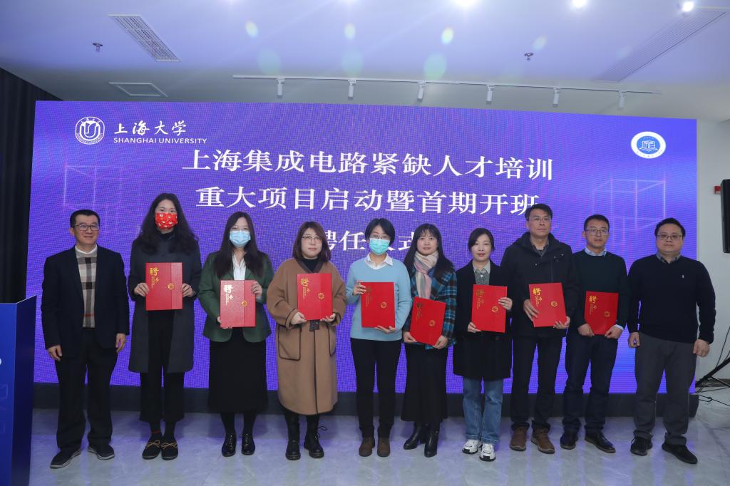 为更好地推进上海集成电路紧缺人才培训,培训班聘任了一支兼具基础知识、集成电路关键技术、产业知识、知识产权管理及实践技能培训能力的产教融合的集成电路培训团队队伍。市经信委人事教育处处长黄春华、电子信息处处长汪潇,市教委高教处吴庆全,嘉定区经济委员会主任陆铁龙,公司党委书记郭纯生、执行经理张建华为培训项目专家讲师发放聘书。