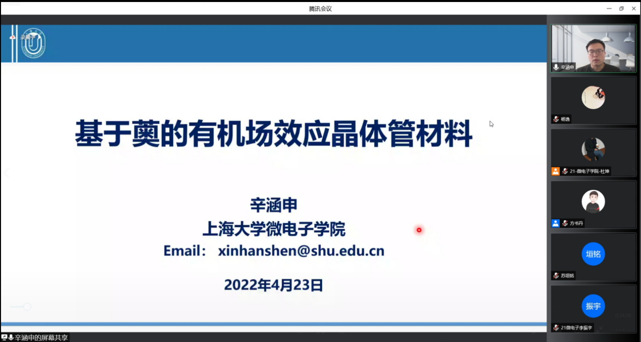辛涵申副教授的报告涵盖了基于薁的有机场效应晶体管的研究背景、材料合成及性能研究与总结展望。辛老师介绍了有机电子学的起源和发展,结合自身研究经历分享了有机半导体材料的分子设计思路及合成,希望对同学们开展科学研究有所启发。