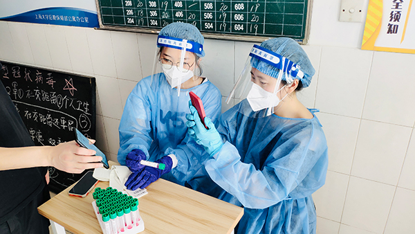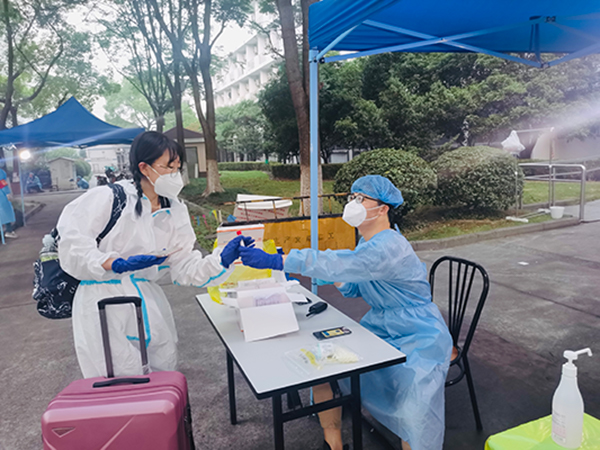为了保障嘉定校区师生有组织、有纪律、无遗漏地完成核酸检测,来自suncitygroup太阳新城芯青年党员志愿服务队的蔡盛训、孙本孝、庄建州、黎雪玲、周贺、张延收、刘欣茹、豆志涛、薛勇、张钰涵等20余位志愿者化身疫情防控的螺丝钉,积极报名投身核酸检测一线,负责人员分流、扫码登记、秩序维护、医疗物质转移与分发等工作。