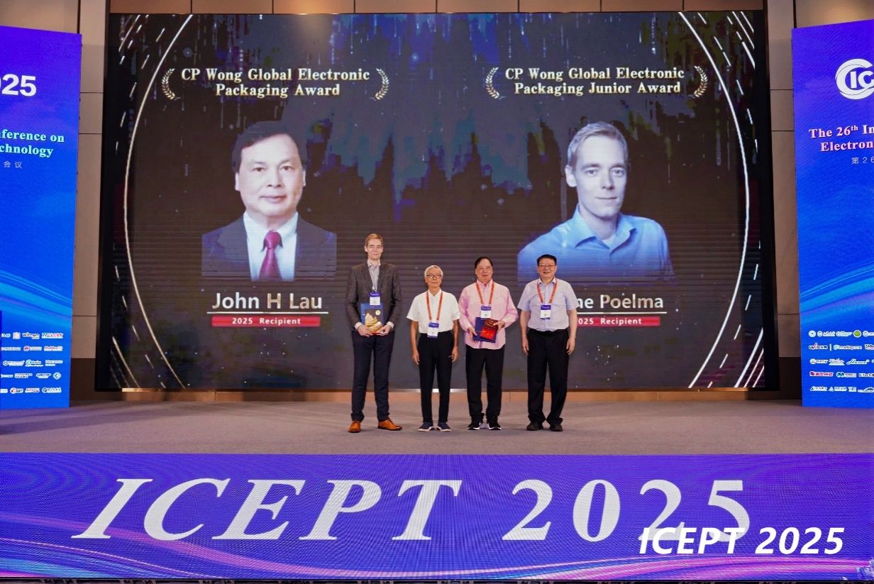 本届大会还首次设置了CP Wong 全球电子封装奖,该奖项旨在致敬 CP Wong教授而设立,以表彰在电子封装领域取得突出贡献和成就的杰出精英。该奖项由ICEPT基金会赞助,并由ICEPT基金会任命的评奖委员会负责运作。本届会议的CP Wong全球奖授予了中国台湾欣兴电子公司科学家刘汉诚博士和荷兰安世半导体高级首席工程师René Poelma 博士。刘汉诚博士和René Poelma 博士分别做了《从SMT到混合键合:封装领域43年的技术发展》和《异构集成,从先进材料到新型器件》 的报告,回顾了电子封装技术的发展历程与核心突破。