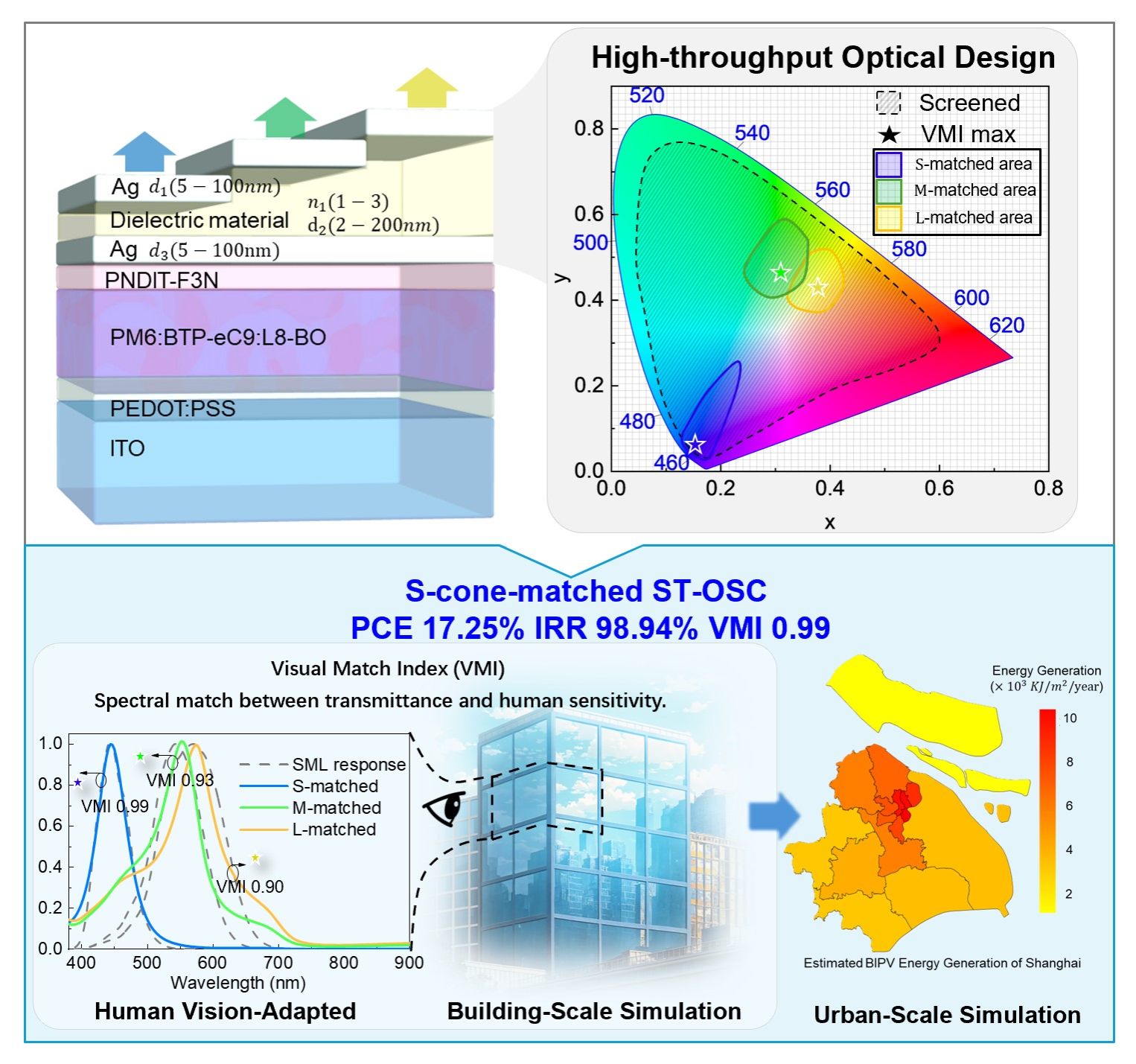 针对上述问题,本研究提出“人眼视觉匹配”的创新设计框架,首次将人类视网膜中S、M、L三类视锥细胞的光谱响应特性引入ST-OSC的光学设计中,简历以人眼视觉感知为基准的色彩调控策略。团队构建了结合Fabry-Pérot光学谐振腔与高通量光学筛选算法的多目标优化体系,并提出“视觉匹配指数(Visual Match Index, VMI)”作为量化指标,用于评估器件发射光谱与人眼色彩感知之间的一致性。通过系统的高通量模拟与实验验证,团队成功制备出分别对应人眼短、中、长波视锥细胞敏感峰值的蓝、绿、红三色ST-OSCs器件,展现出卓越的色彩真实度(VMI > 0.9),并同时实现了超过17%的能量转换效率与98%以上的红外阻隔率,达成发电、隔热与美学性能的高度融合。研究团队进一步以上海市为典型案例,开展城市尺度的能源效益评估。结果表明,若将此类彩色ST-OSCs广泛应用于建筑立面,不仅可实现自然采光与视觉舒适,还可显著降低建筑制冷能耗,年发电潜力预计可达上海市2024年总用电量的约三分之一,展现出在低碳城市建设中的广阔应用前景。
